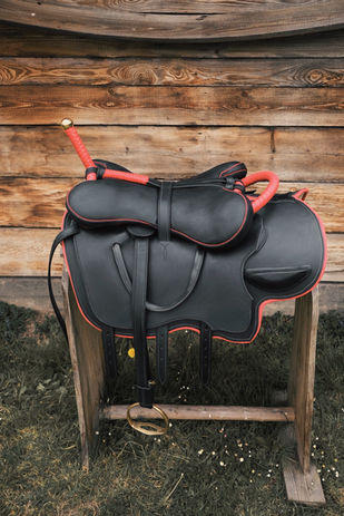 This saddle is of the classic Cossack type, inspired by traditional Eastern military saddles. It features a cushioned soft pad and can be crafted with various types of rear grips and in almost any color combination. The sides can be embroidered or engraved with a logo or ornament. The saddle is supplied with basic belly belts and a breastcollar. It comes also with stirrup straps, stirrups, and a strap between the stirrups.